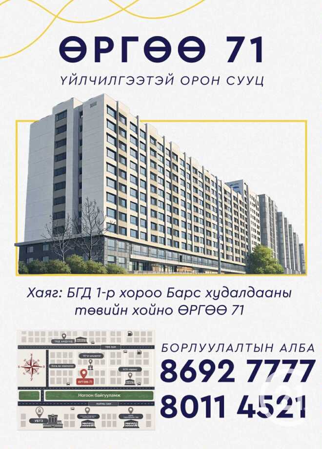 Нарны зам дагуу ашиглалтанд орсон "Өргөө 71" үйлчилгээтэй орон сууцанд 2 өрөө байр сонголттойгоор борлуулна