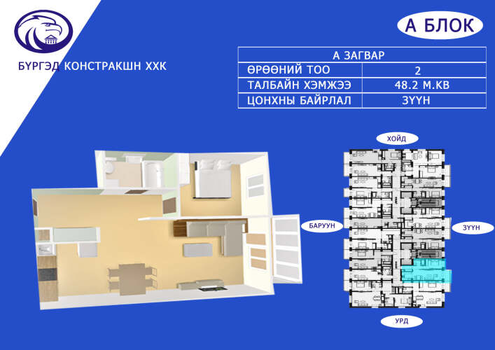 Дэлгэрэх апартмент хотхонд 2 өрөө