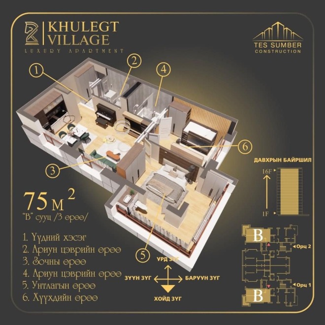 Хүлэгт Виллаж Khulegt Village 2 өрөө байр зарна.