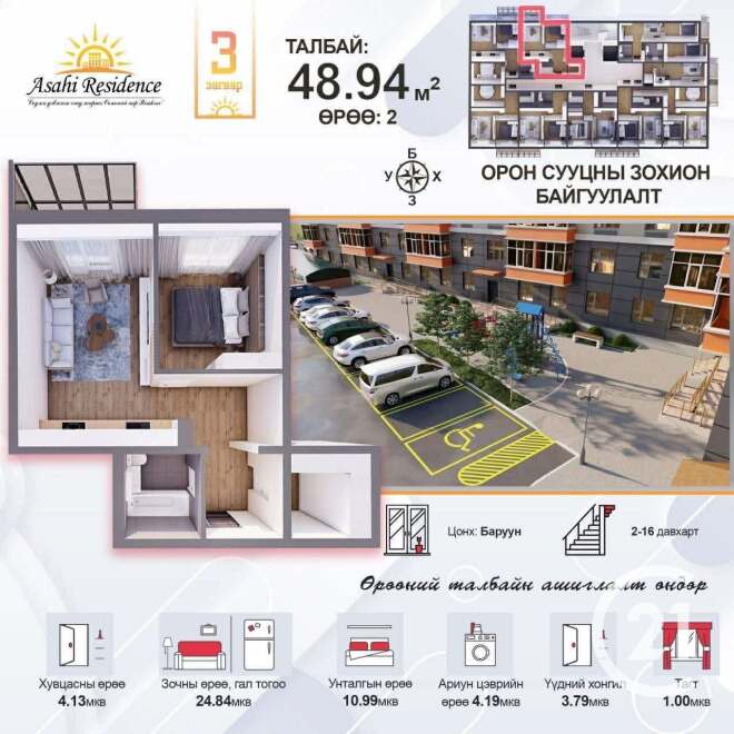 БЗД 10-р хороо Asahi Residence 46.17 мкв 2 өрөө байр худалдана